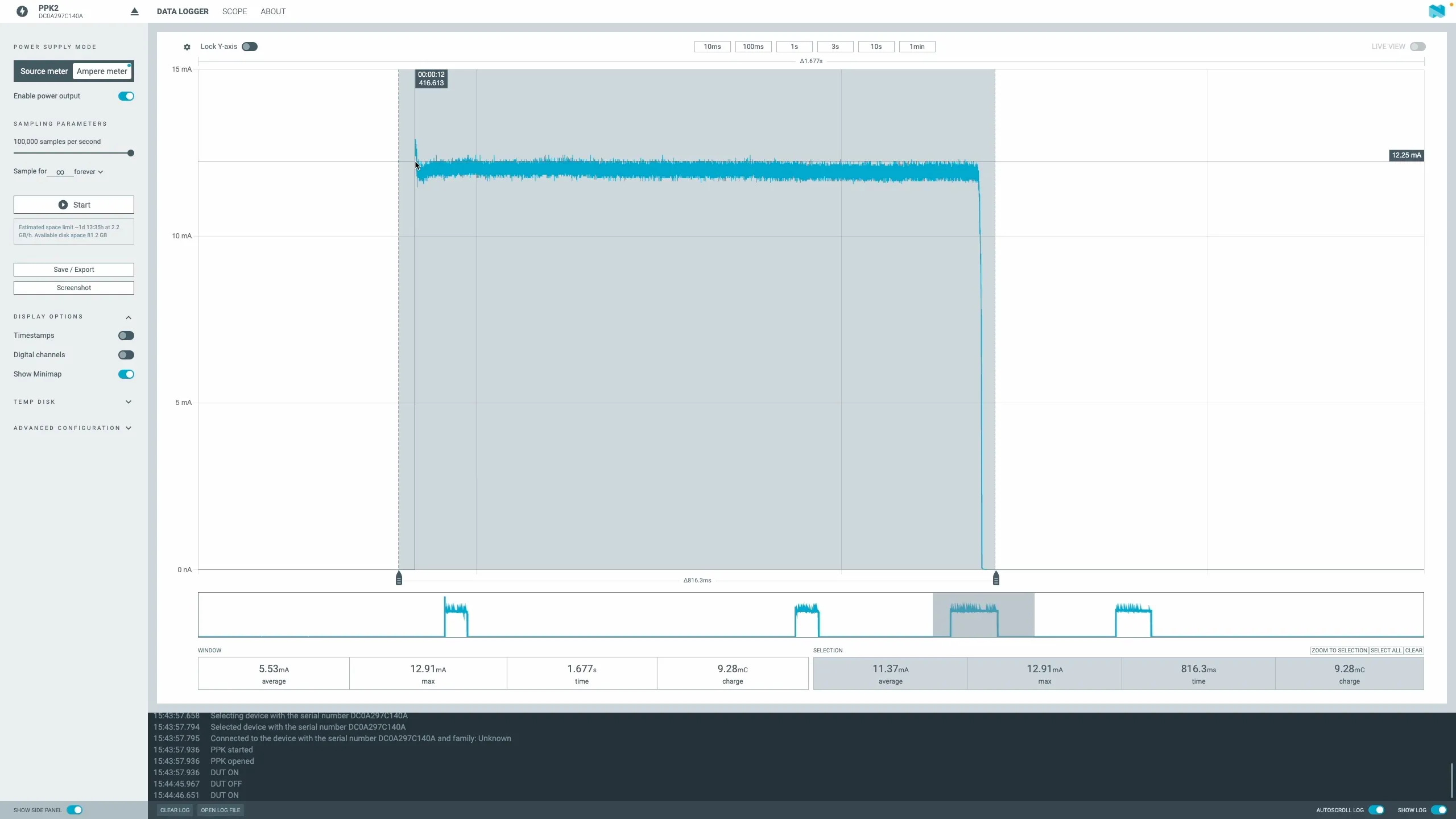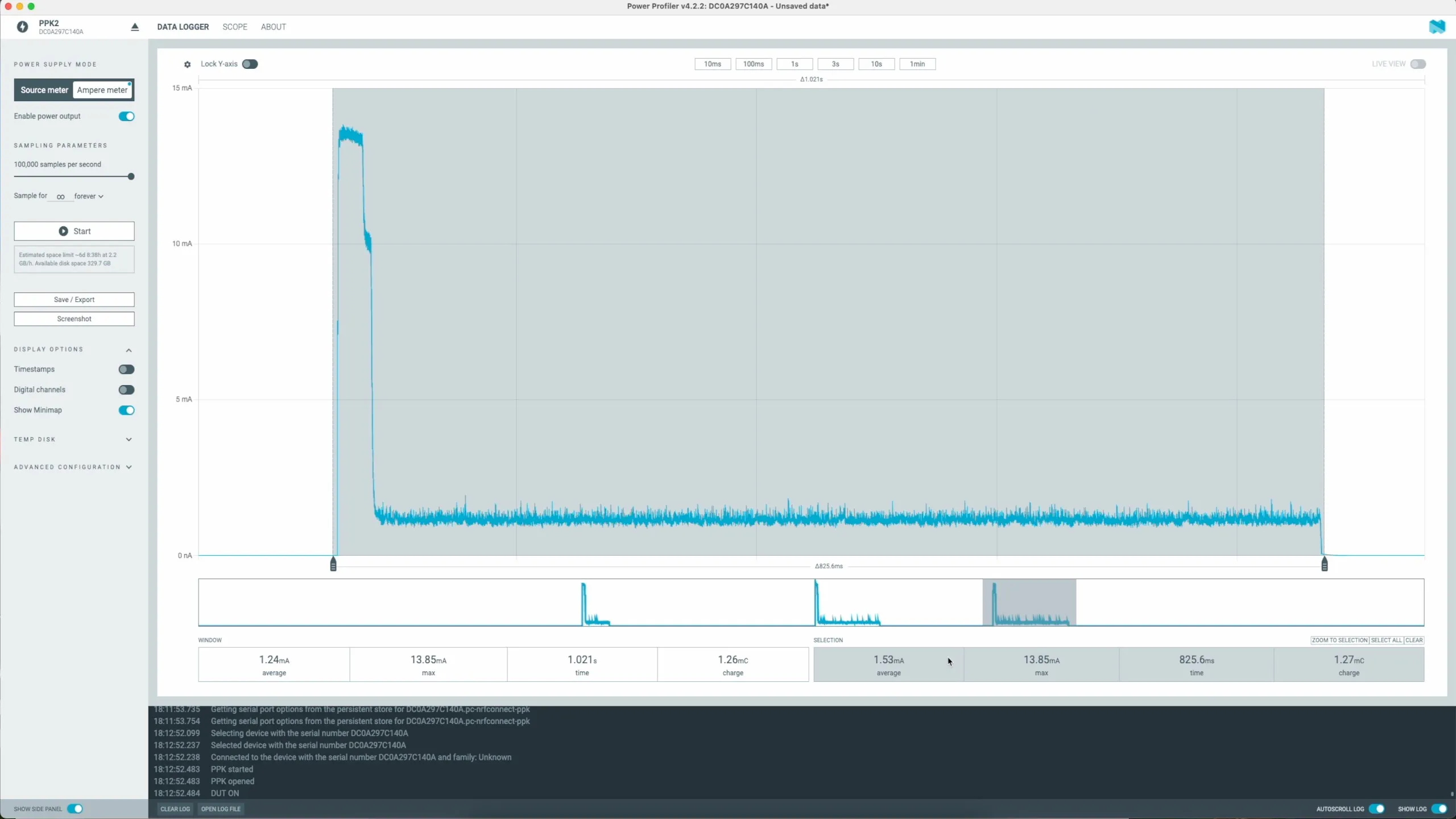 One thing I was interested in is how much current we are drawing from the coin cell, so I hooked up my Nordic power monitor and gave it a test.